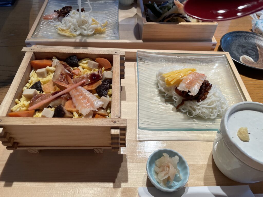 頼んだのは「蒸し柿の葉寿司天ぷらセット」と三輪そうめんのついた「蒸し寿司セット」。